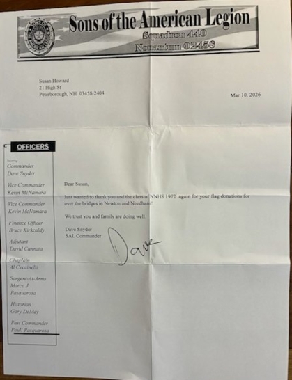 If you've been following our page you know we have been donating scholarship money to one NHS graduate each year who is first in their family to attend college and who has demonstrated a record of academic achievement, volunteerism, and community service. In addition to providing this scholarship we also made the decision to honor some of our classmates who served in the US military. To do this we contacted the American Legion and asked about their Flag Program. You may have seen Flags being flown on bridges over in Newton and Needham. One of those flags represents the Military Veterans of the Class of 72.